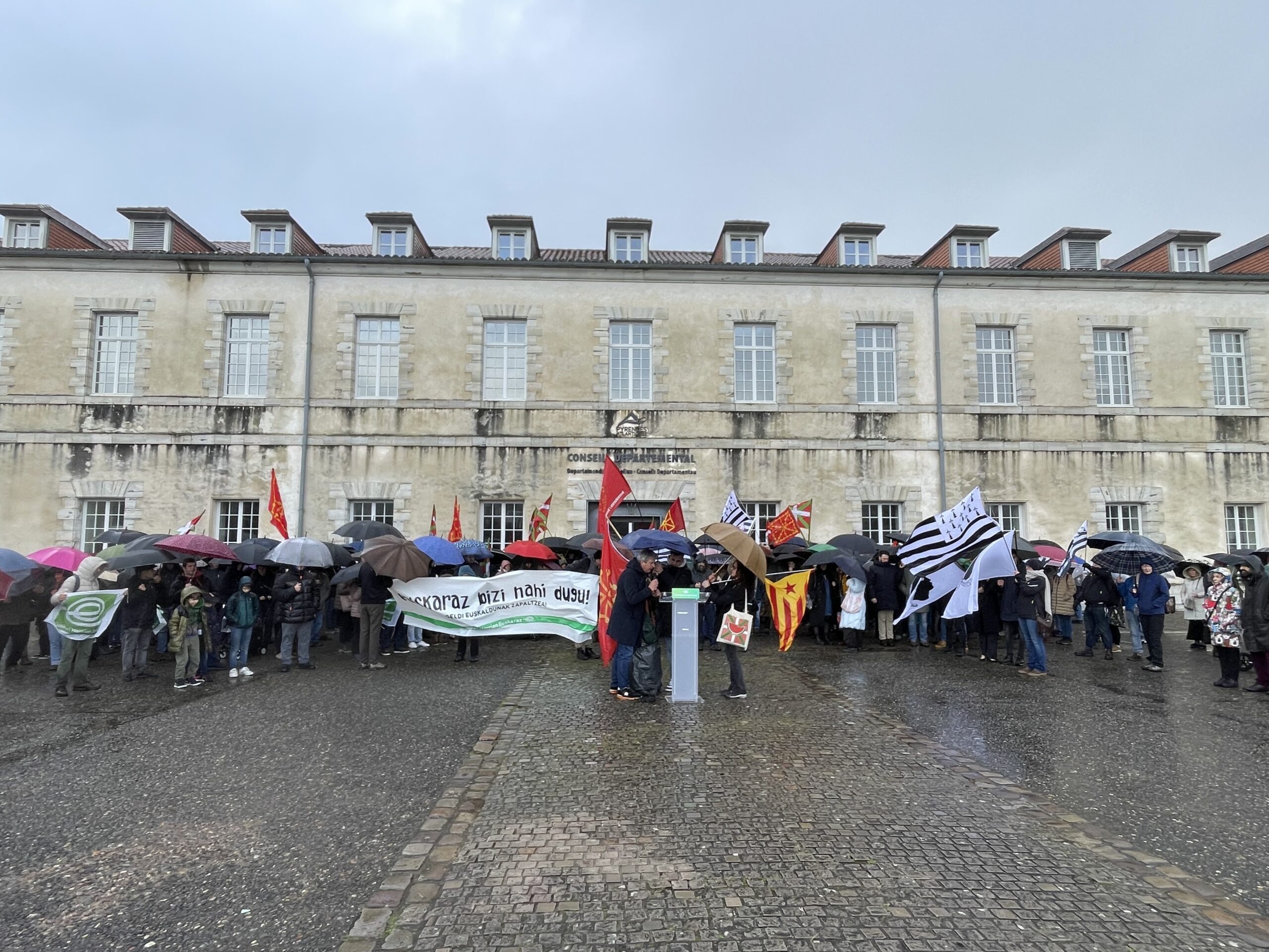 Le lendemain a eu lieu le rassemblement prévu en soutien aux militants basques devant le bâtiment du Conseil départemental des Pyrénées-Atlantiques. Malgré le temps pluvieux, environ 200 personnes ont répondu à l’appel lancé par Euskal Herrian Euskaraz, revendiquant alors la reconnaissance des droits linguistiques pour lesquels luttent les défenseurs du basque qui ont été convoqués le 5 février 2026 au tribunal de Baiona.